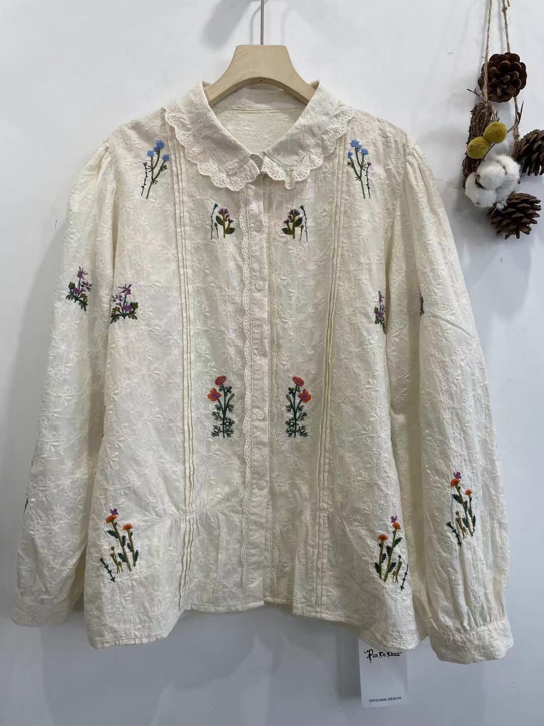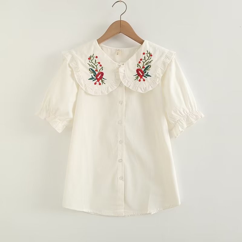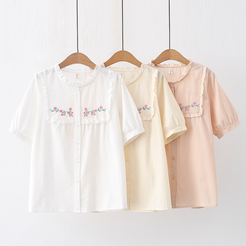 Kemeja Gaya Mori Kerah Boneka Bordir Bunga Lucu Musim Semi Longgar Murid Usia Muda Sweet Dilipat Atasan Sastra Wanita