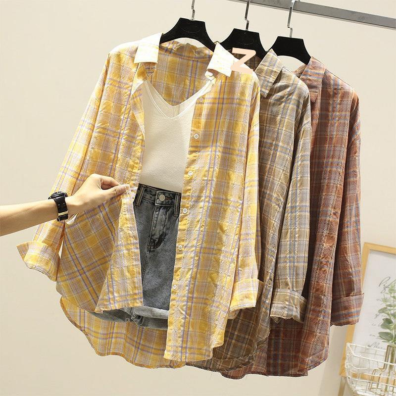 Kemeja kotak-kotak tabir surya tipis katun, mantel siswa kemeja kotak-kotak longgar wanita musim semi/musim panas baru 2024