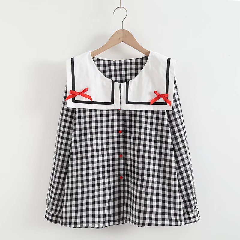 Kemeja lengan panjang siswa perempuan kotak-kotak kerah angkatan laut pita kartun baru musim gugur grosir wanita