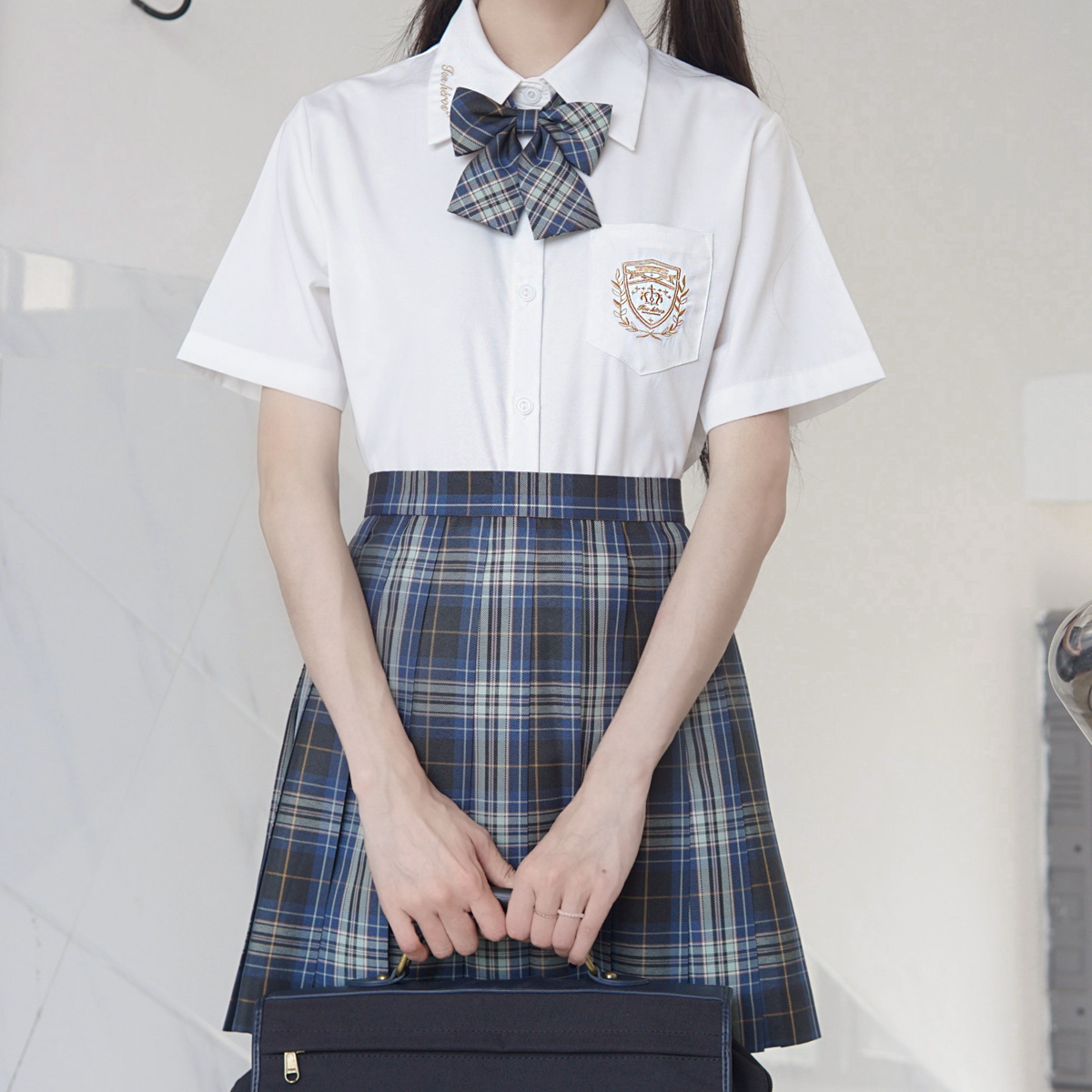 Setelan seragam kelas penampilan, seragam seragam penampilan inggris, kemeja gaya preppy jk, rok panjang berlipat biru laut, kostum performa paduan