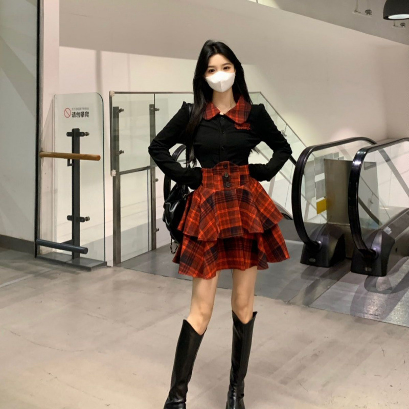 Kemeja Setelan Seragam JK Gaya Murni Wanita Gemuk Atasan Rok Pendek Pinggang Tinggi Kotak-Kotak Model Baru 2025 Setelan Terlihat Kurus Wanita
