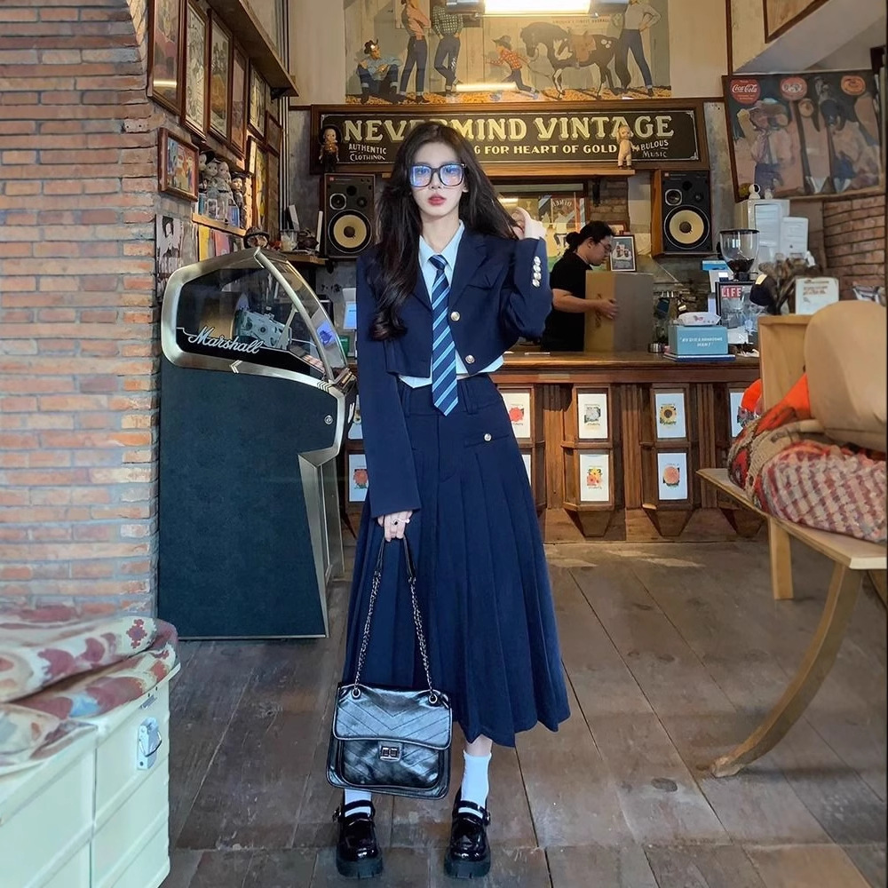 Setelan Gaya Akademi Departemen Korea Kemeja Jaket Fashion Seragam JK Musim Panas Rok Panjang Sedang Rok Lipit Terlihat Langsing Tiga Potong