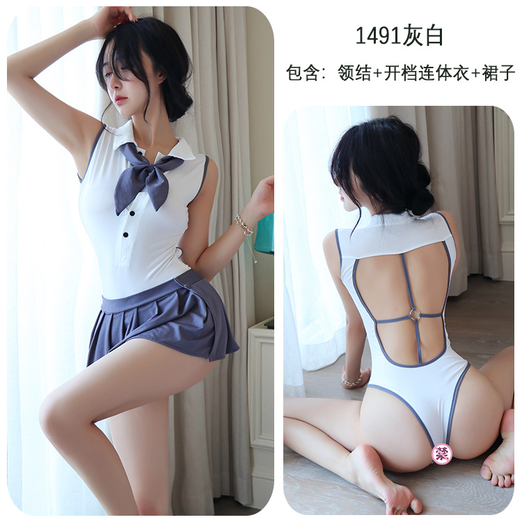 Lingerie seksi malam panjang seragam kampus seksi, jumpsuit gairah seksi menggoda, 1491 wanita terbuka bebas