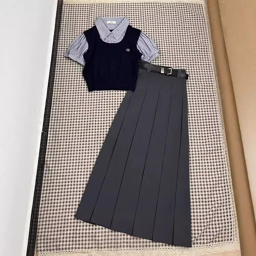 Dua Potong/Setelan Baju Atasan Model Pendek Dua Potong Garis-Garis Kontras Gaya Inggris Rok Pinggang Tinggi Siswa Wanita