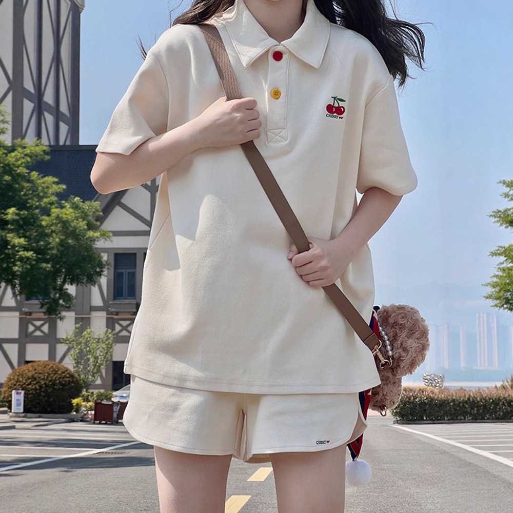 Setelan olahraga gaya preppy kasual wanita, kaos polo lengan pendek longgar gaya Korea pelajar musim panas dua potong