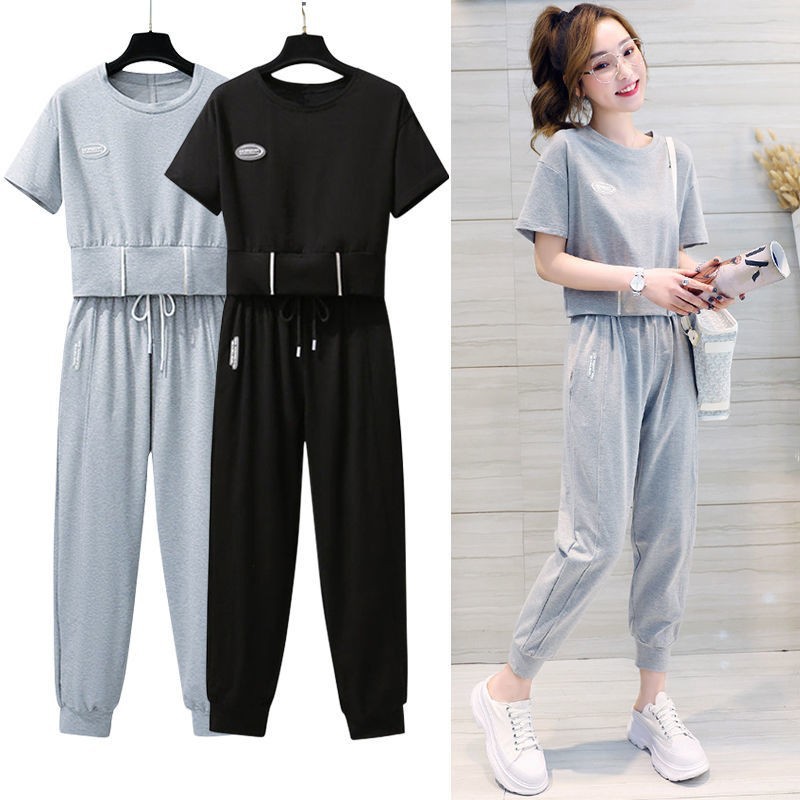 Setelan olahraga kasual lengan pendek wanita, atasan longgar pendek celana crop siswa dua potong musim panas