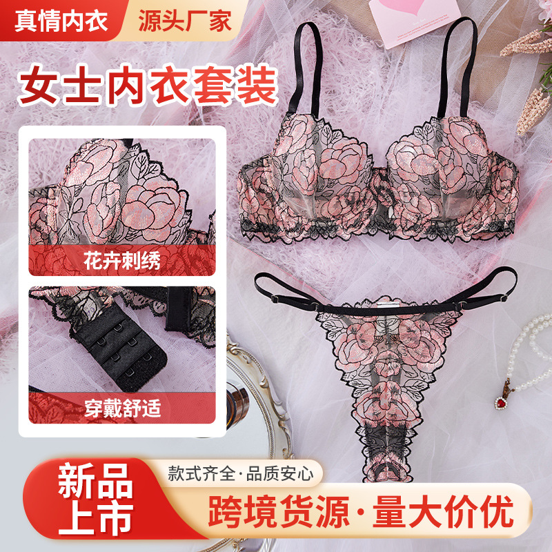 Pakaian Dalam Elegan Berongga Perspektif Warna Kontras Seksi Eropa dan Amerika Pakaian Dalam Kombinasi Bordir Bunga Prancis Set Pabrik Grosir