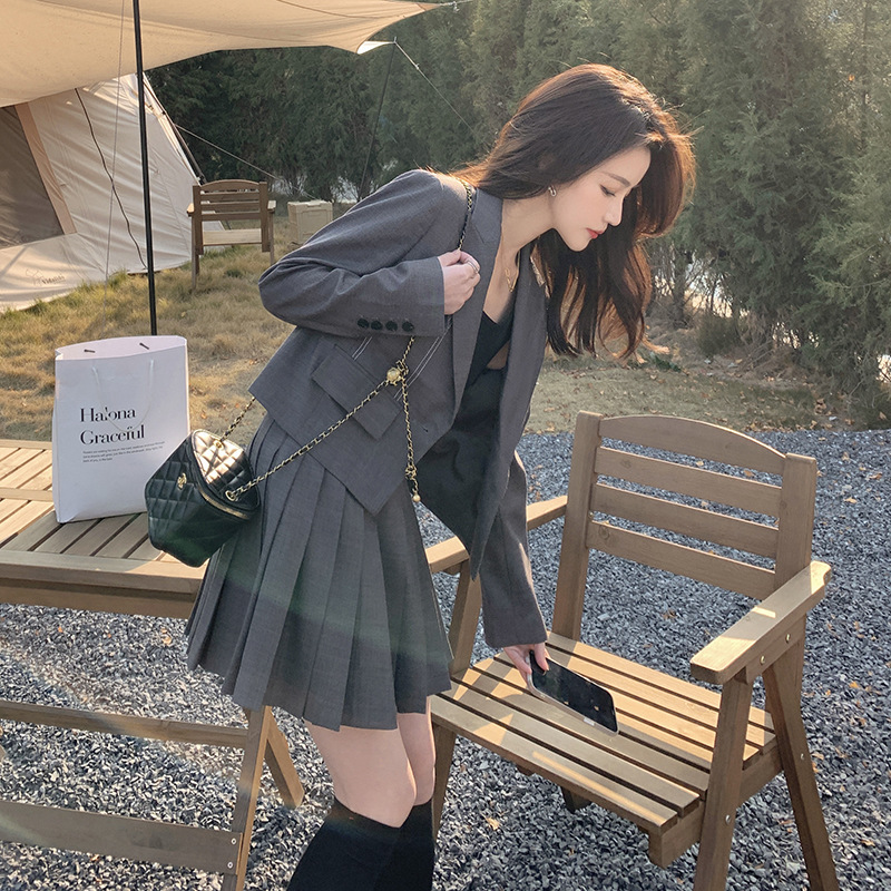 Setelan jaket abu-abu setelan kecil wanita 2024 musim semi dan musim gugur rok berlipat pendek pelajar gaya Korea baru setelan dua potong