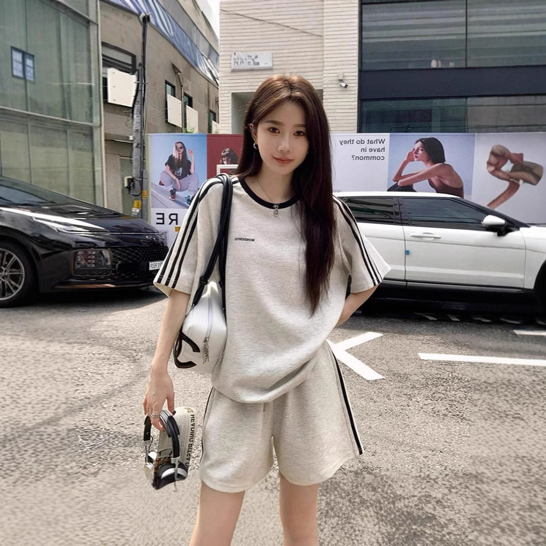 Set Pakaian Olahraga Kasual Katun Murni 2025 Celana Pendek Lengan Pendek Modis Versi Korea Longgar Pelajar Musim Panas Wanita Set Dua Potong Lari