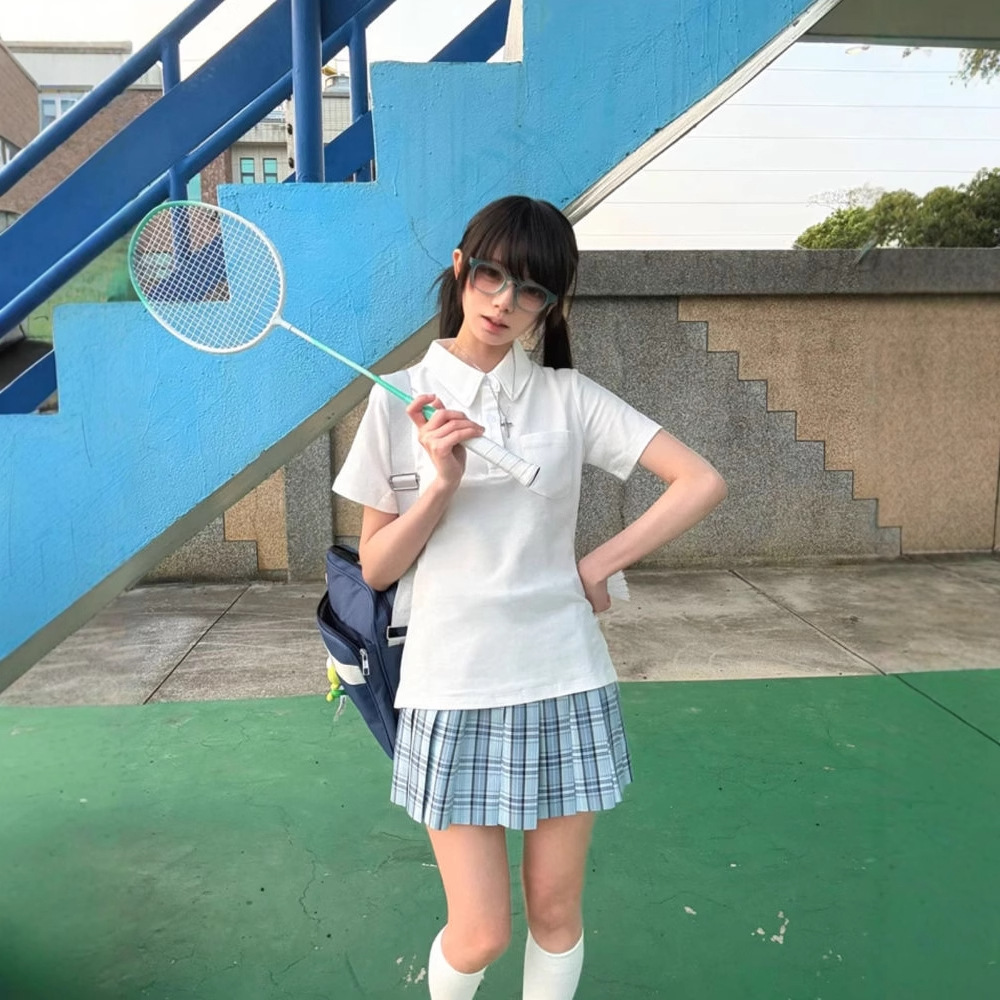 JK Pakaian Sekolah Seragam Kemeja POLO Lengan Pendek Ketat Pinggang Kaus Kerah Polo Dasar Komuter Perguruan Tinggi Jepang Atasan Wanita
