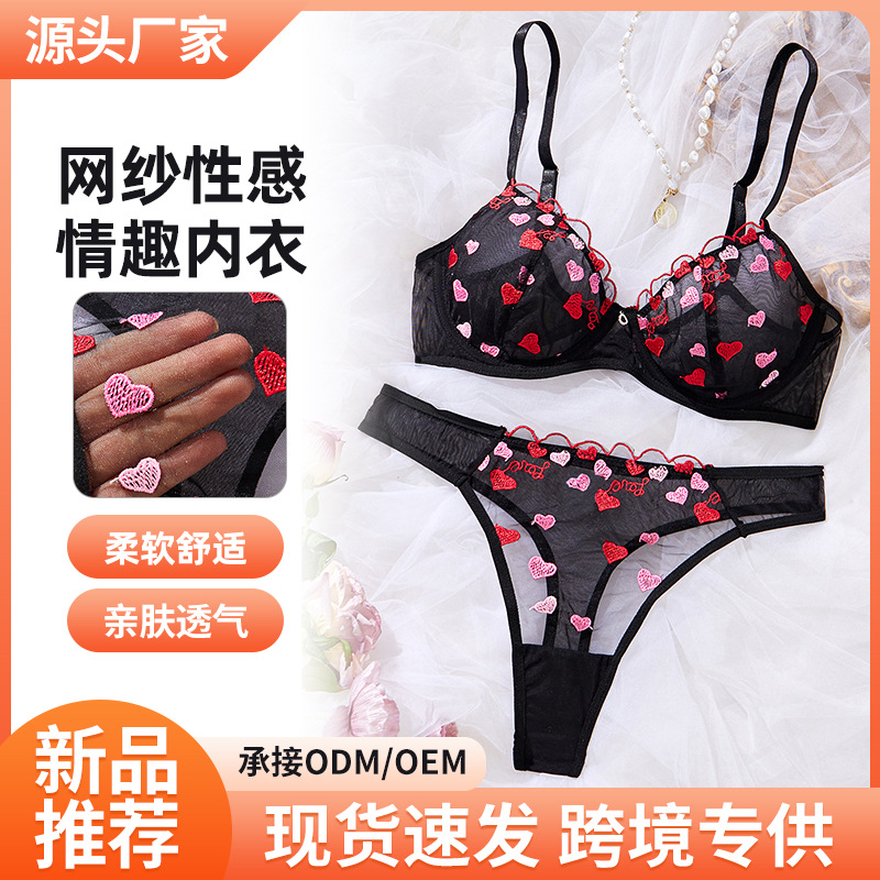 Pakaian Dalam Super Tipis Murni dan Super Tipis Bordir Warna Hitam Bordir Warna Hitam Setelan Seksi Jaring Hati Warna Merah Muda Seksi Model Baru Eropa dan Amerika