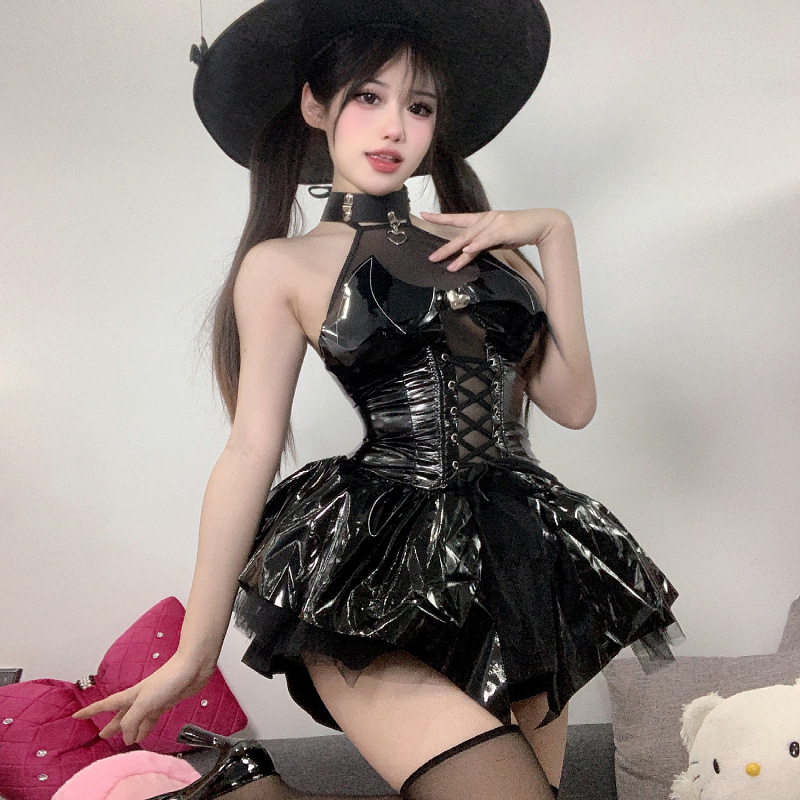 Rok kulit setan kecil seksi mengilap PU halter setelan rok renda pakaian seragam Jepang jk COS pakaian wanita dua dimensi