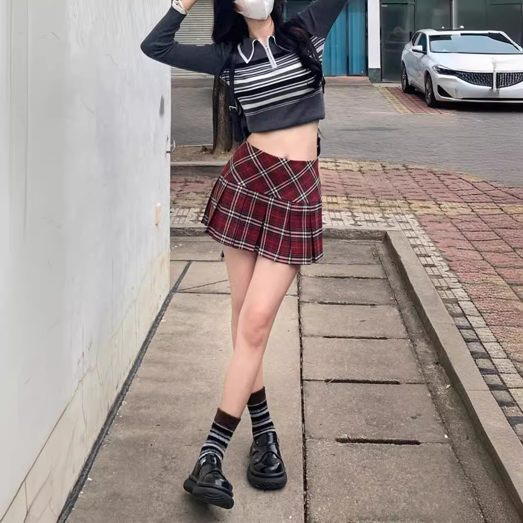Rok lipit warna kontras kotak-kotak untuk wanita, Rok lipit JK pinggang tinggi bergaya retro pinggang tinggi musim gugur musim dingin 2023
