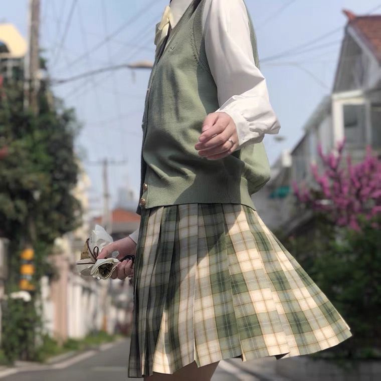 Rok seragam JK Jepang, Rok lipit Jepang kotak-kotak pinggang tinggi, rok kotak-kotak, rok seragam sekolah, rok Gunung & pohon