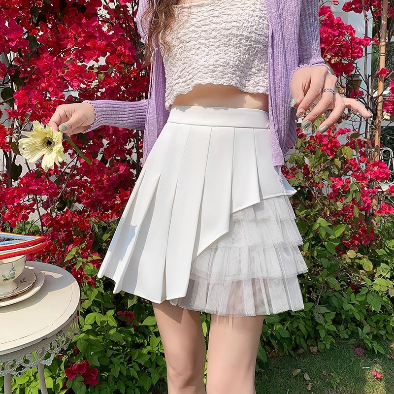 Rok hitam jahitan jala tidak beraturan, Rok lipit a-line jk, rok putih baru musim panas 2024