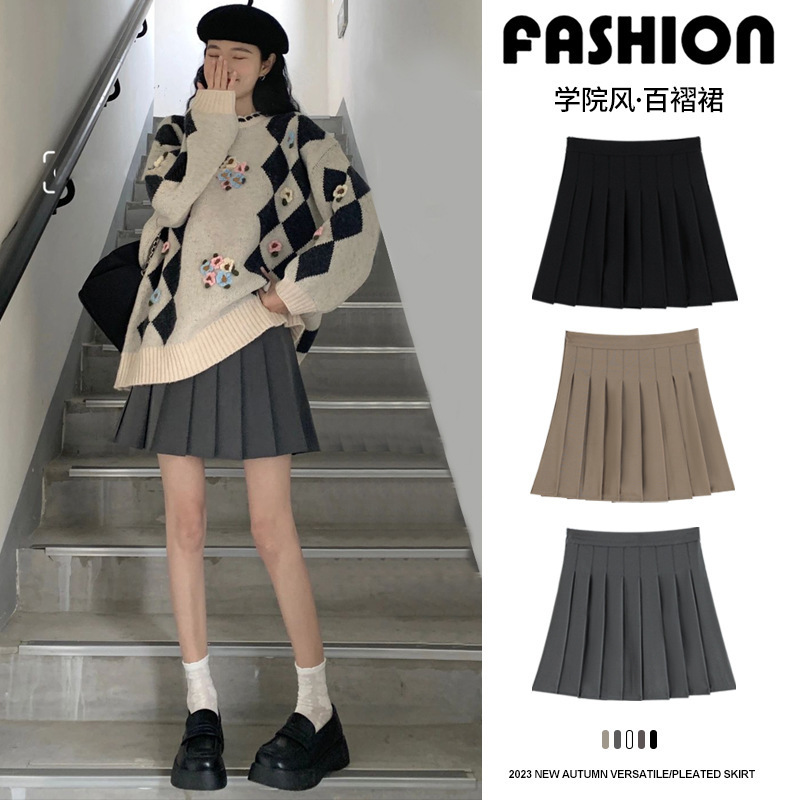 Rok berlipat Korea Selatan wanita musim semi, musim panas, musim gugur dan musim dingin 2023 rok abu-abu gaya preppy pinggang tinggi jk rok pendek coklat a-line