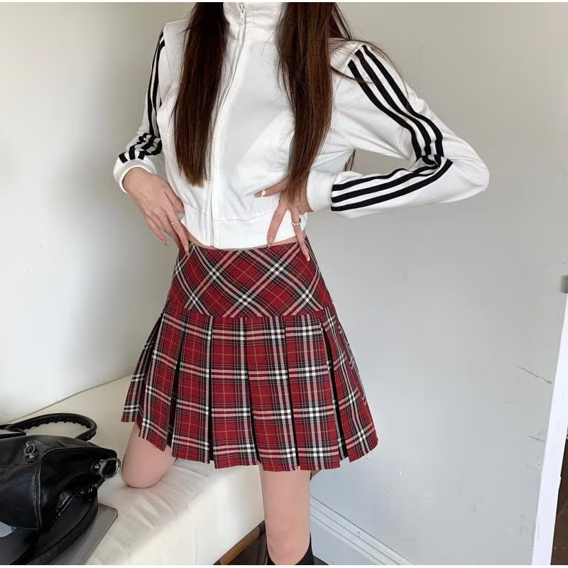 Rok Lipit Kotak-Kotak Merah Gaya Amerika Retro Rok Setengah Badan JK Gadis Pedas Gaya Desain Musim Semi Musim Gugur Rok Pendek Huruf A Gaya Kampus