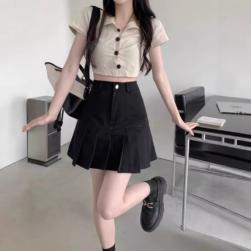 Rok Pendek Denim Lipit Versi Korea Model Baru Musim Semi 2025 Rok Setengah Badan Mudah Dipadu Padan Wanita Murid Terlihat Langsing Pinggang Tinggi Model Hitam