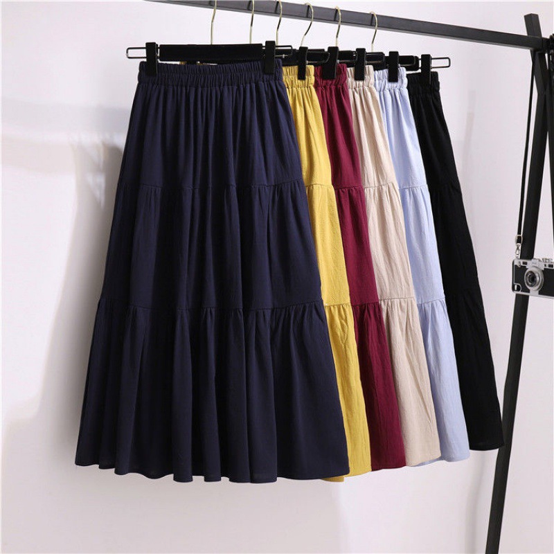 Rok katun dan linen jahitan baru musim panas siswa warna solid rok berlipat pinggang elastis kue a-line ukuran besar