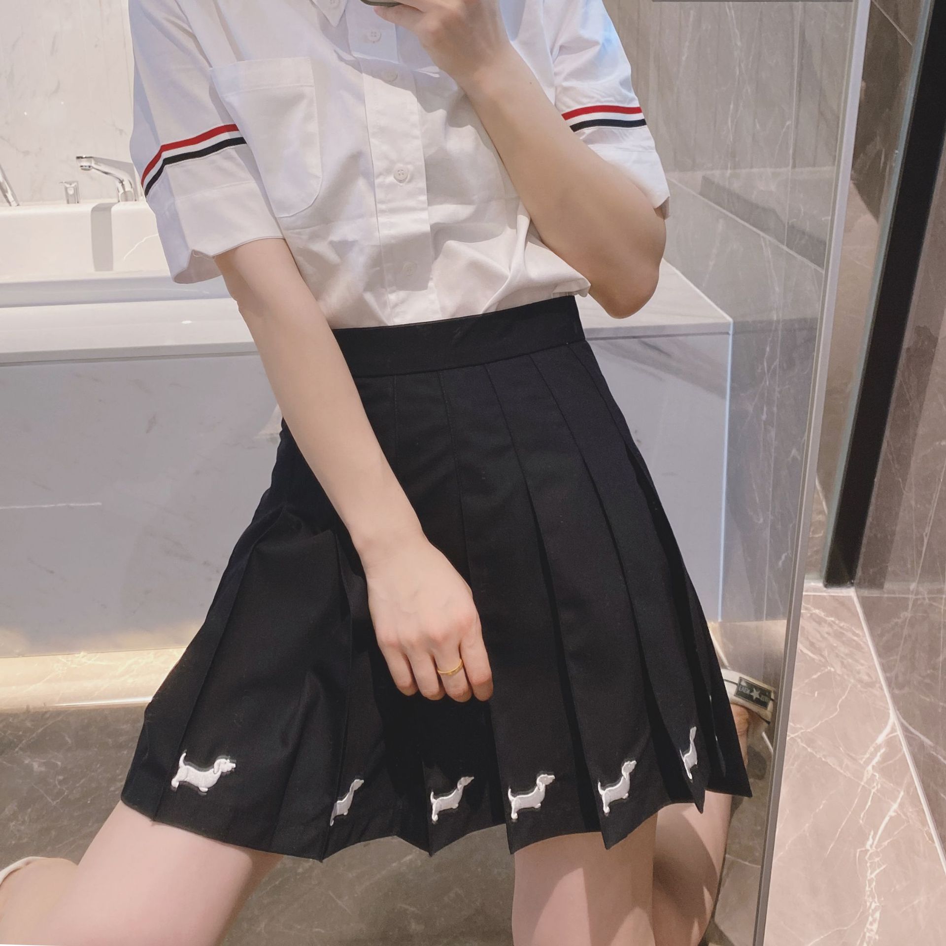 Tb hem rok bordir anak anjing rok lipit musim panas wanita rok siswa baru rok a-line pelangsing pinggang tinggi