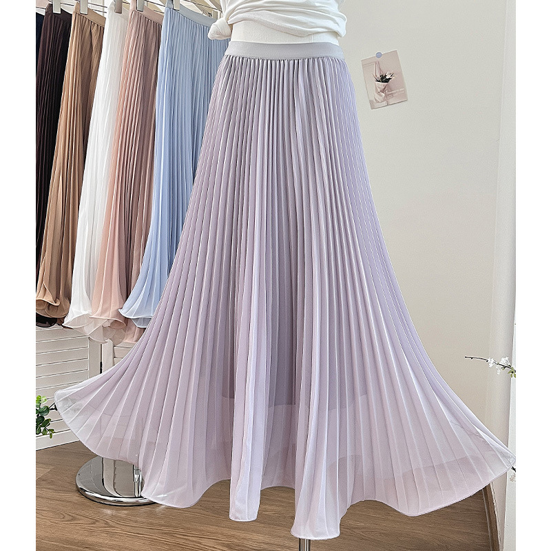 Rok Panjang Gaya Korea Sifon Besar Warna Ungu 25 Musim Semi Musim Panas Modis Mudah Dipadu Padan Longgar Lipit Rok Setengah Badan Wanita Pinggang Elastis