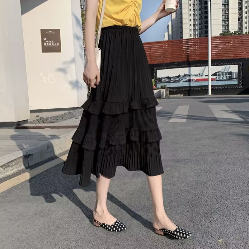 Rok Setengah Badan Warna Putih Rok Lipit Model Baru 2025 Model Panjang Sedang Musim Panas Wanita Rok Elegan Musim Panas Rok Panjang Sifon A-Line