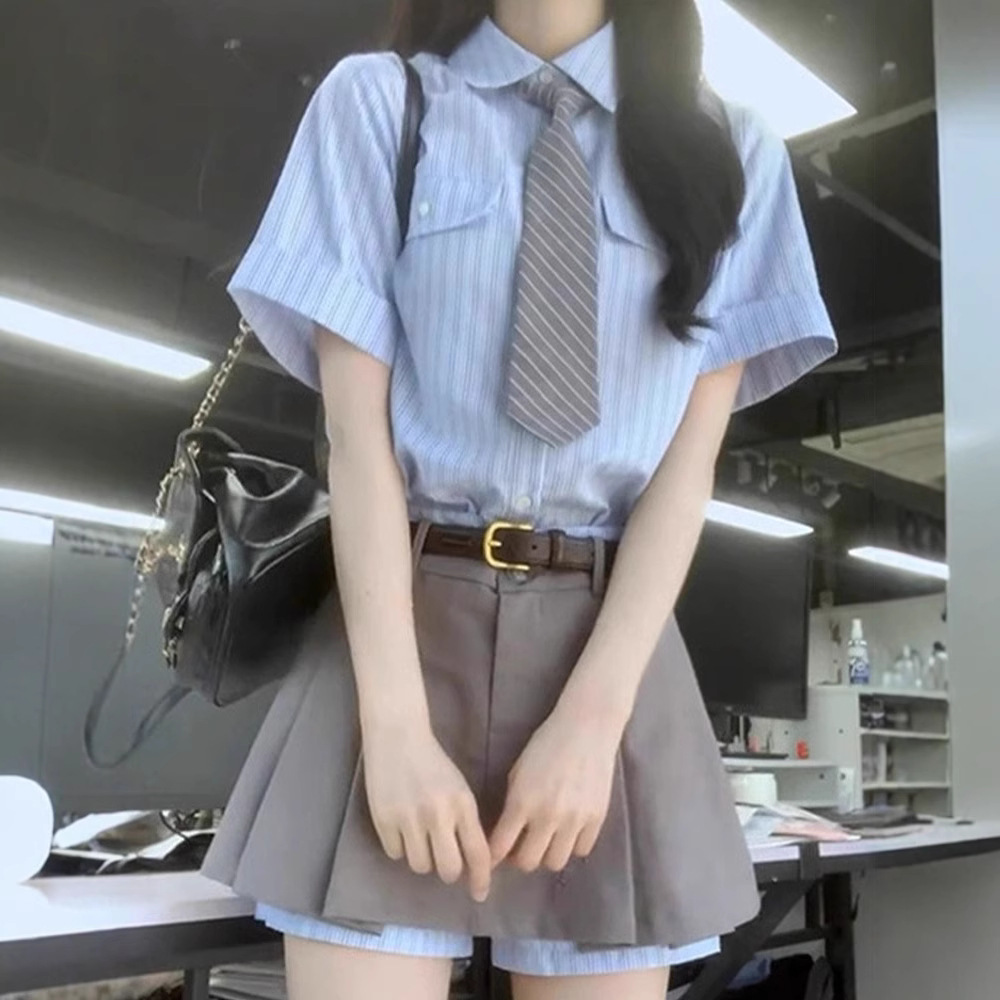 Setelan Pakaian Seragam JK Gaya Kampus Wanita Musim Panas Gadis Panas Murni di Kampus Rok Lipit Kemeja Garis-Garis Manis Murni