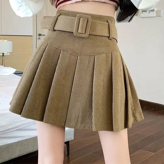 Rok lipit Corduroy untuk wanita, Rok lipit model A- Line ramping pinggang tinggi pinggang tinggi musim semi dan musim gugur baru 2024