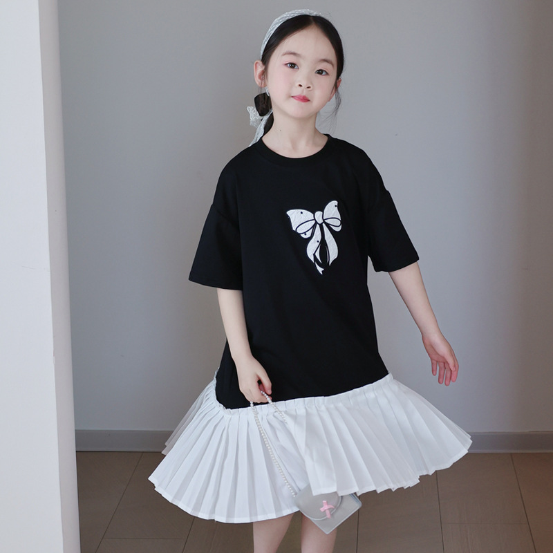 Rok T-shirt Musim Panas Anak Perempuan Model Tipis Gaun Lengan Pendek Kasual Anak Perempuan Pakaian Musim Panas Anak Rok Kombinasi Lipit Gaya Barat