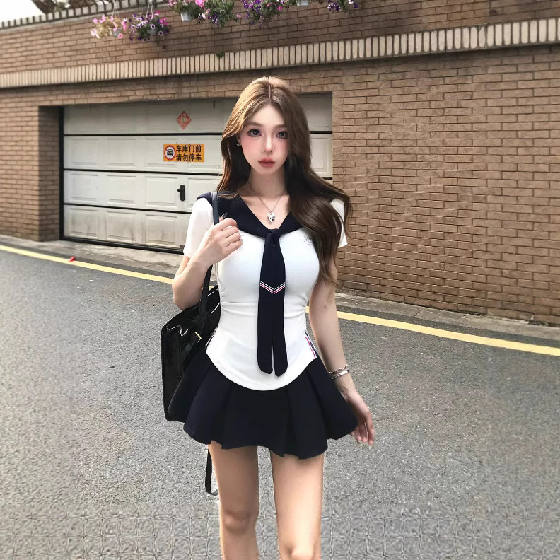 T-shirt Lengan Pendek Slim Fit Pinggang JK Seragam Gaya Sekolah Murni Atasan Wanita Gadis Pedas Rok Setengah Lipit Set Tiga Potong Musim Panas