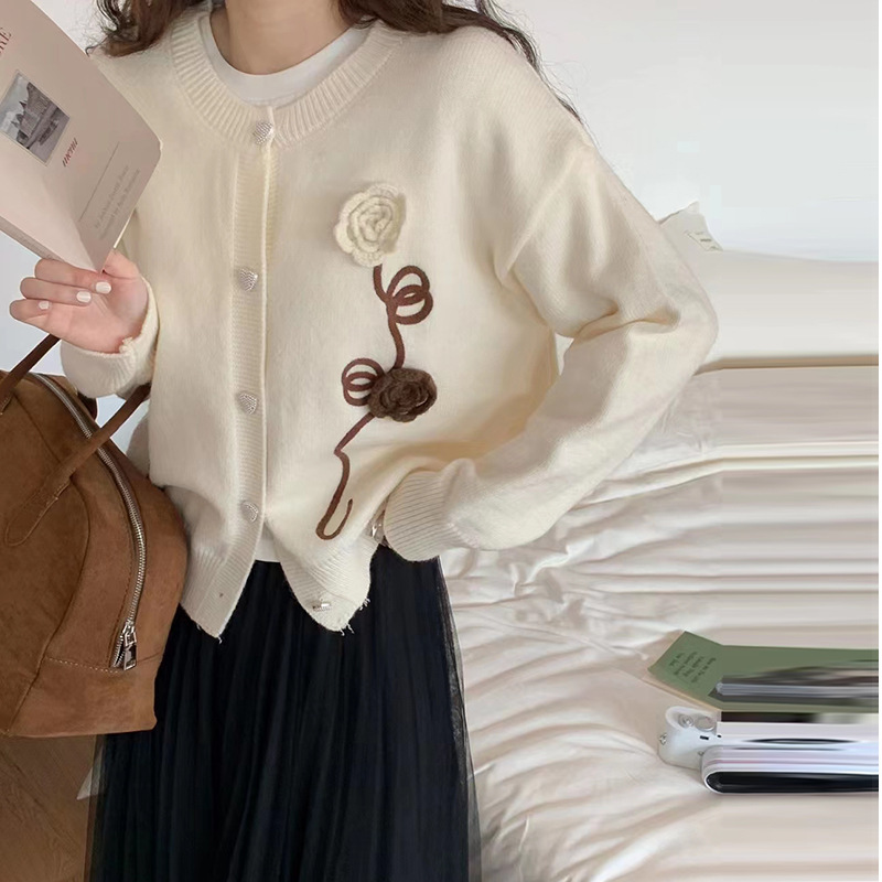 粉色立体花朵毛衣开衫女早秋新款甜美宽松百搭洋气针织衫外套