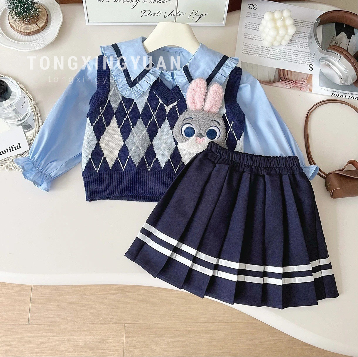 Tongxing Bulat Musim Semi dan Musim Gugur Model Baru Anak Perempuan Kelinci Petugas Polisi JK Seragam Lucu Set Rok Romas Rajutan Anak-anak