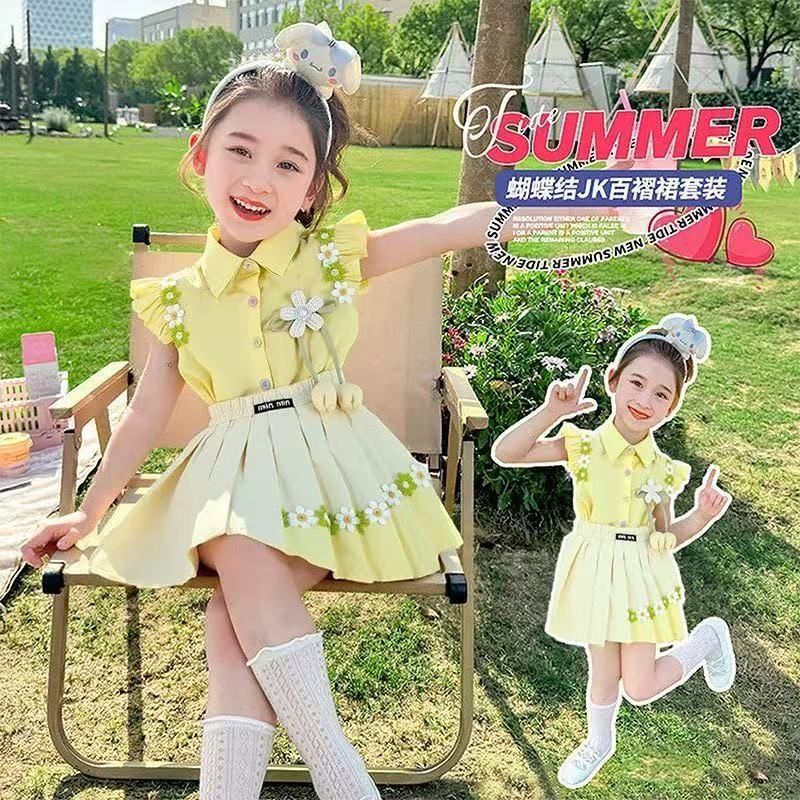 Set Dua Potong Rok Lipit Gradien Kemeja Lengan Terbang Gaya Sekolah Anak Perempuan Rasa Musim Panas 2025