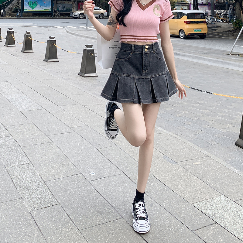 Rok lipit Denim model Korea, rok lipit wanita, rok retro pelangsing serbaguna, rok Denim ketat pinggang tinggi, model Korea, baru, musim panas, untuk anak perempuan