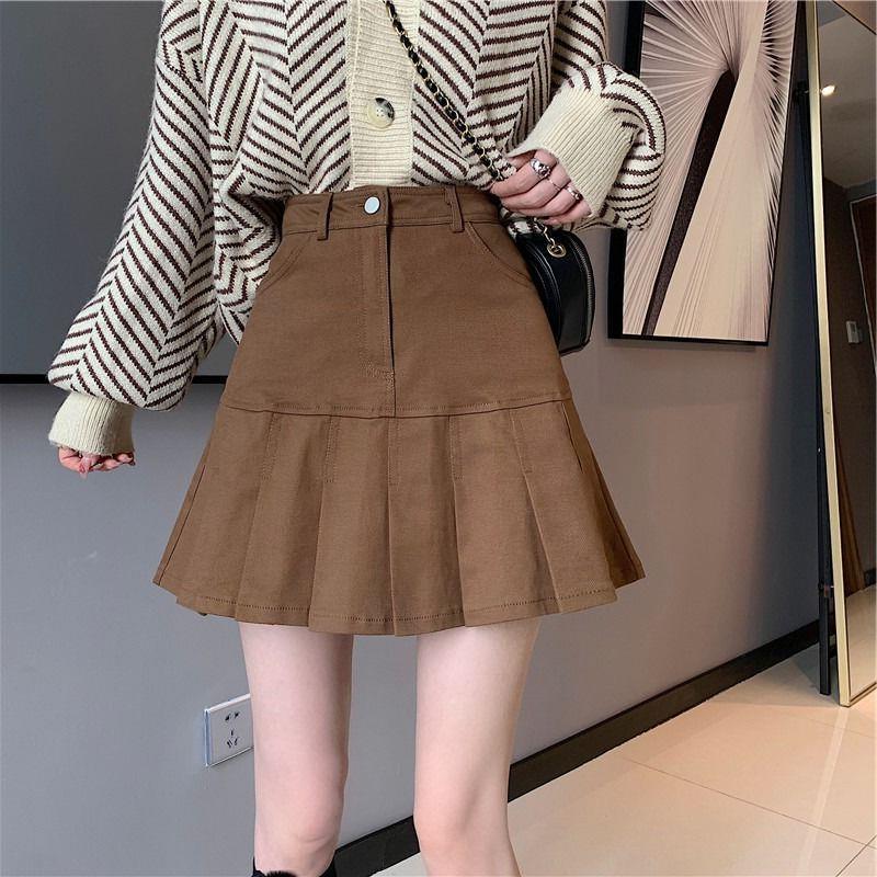 Rok lipit Retro warna polos, Rok lipit serbaguna untuk pelajar, rok A line pelangsing pinggang tinggi musim gugur