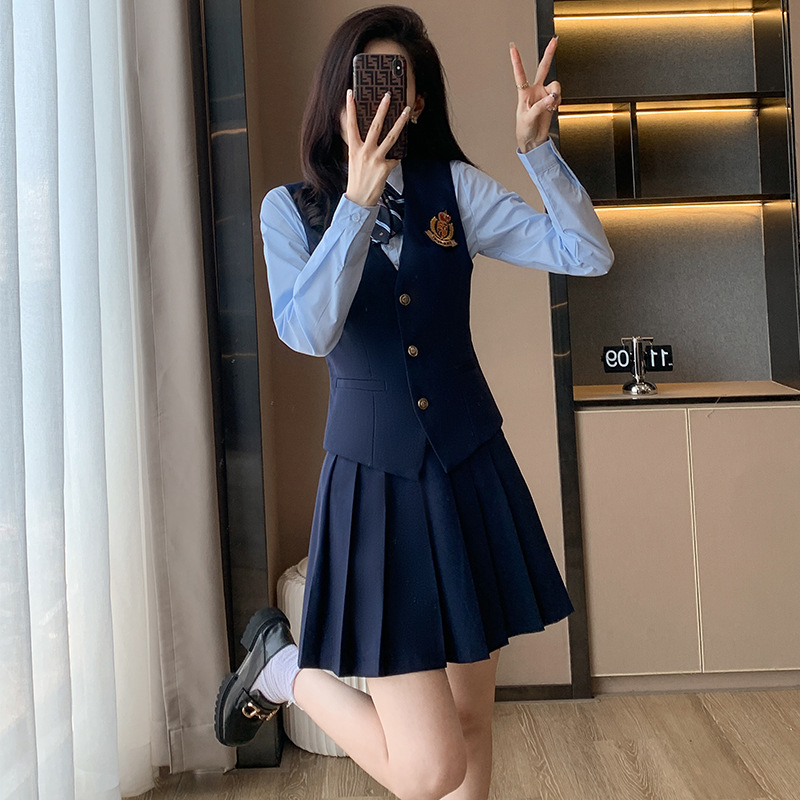 Seragam sekolah siswa sekolah menengah seragam kelas setelan gaya Inggris preppy jk kemeja biru laut rok berlipat rok panjang kostum paduan suara