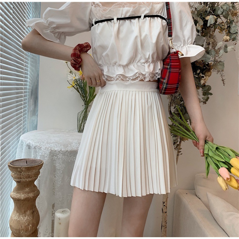 Real shot rok wanita musim panas gaya Korea pinggang tinggi pelangsing chic putih rok berlipat a-line rok pendek untuk siswa