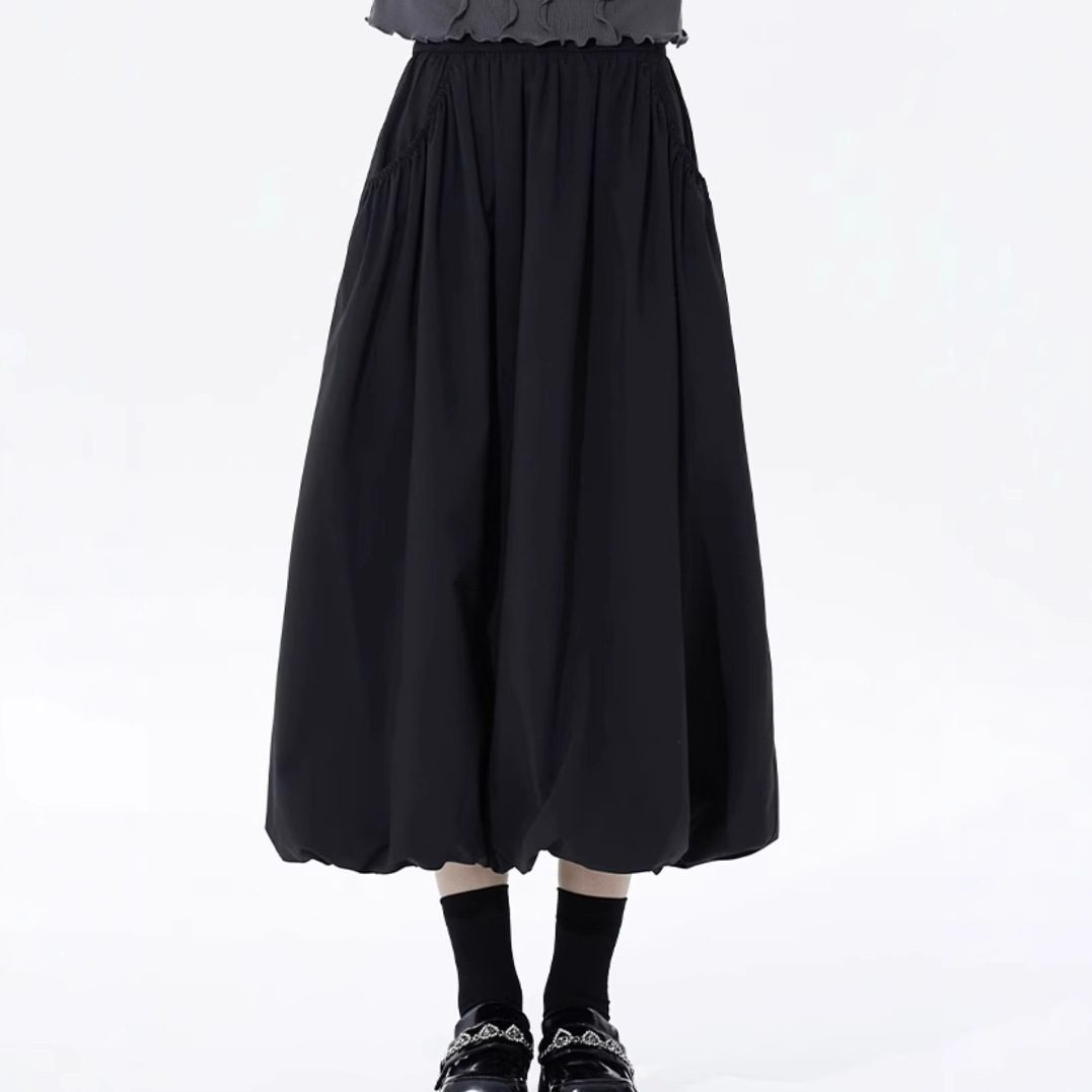 Rok Setengah Badan Rajutan Berkerut Warna Hitam Rok A-Line Orang Kecil Retro Longgar Pinggang Elastis Lembut Terlihat Langsing Model Panjang Musim Semi
