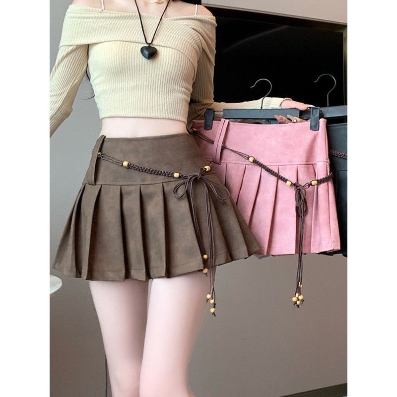Rok Kulit Gadis Pedas Gaya Amerika Rok Setengah Badan Lipit Warna Coklat Model Tua Rok Pendek Huruf A Terlihat Kurus Pinggang Tinggi Maillard Musim Gugur Wanita