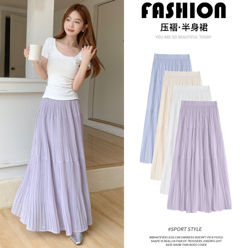 Rok Setengah Badan Ungu Rok Payung Terlihat Langsing A-Line Pinggang Tinggi Model Baru 2025 Musim Panas Wanita Rok Panjang Lipit Rok Kue Berbadan Kecil