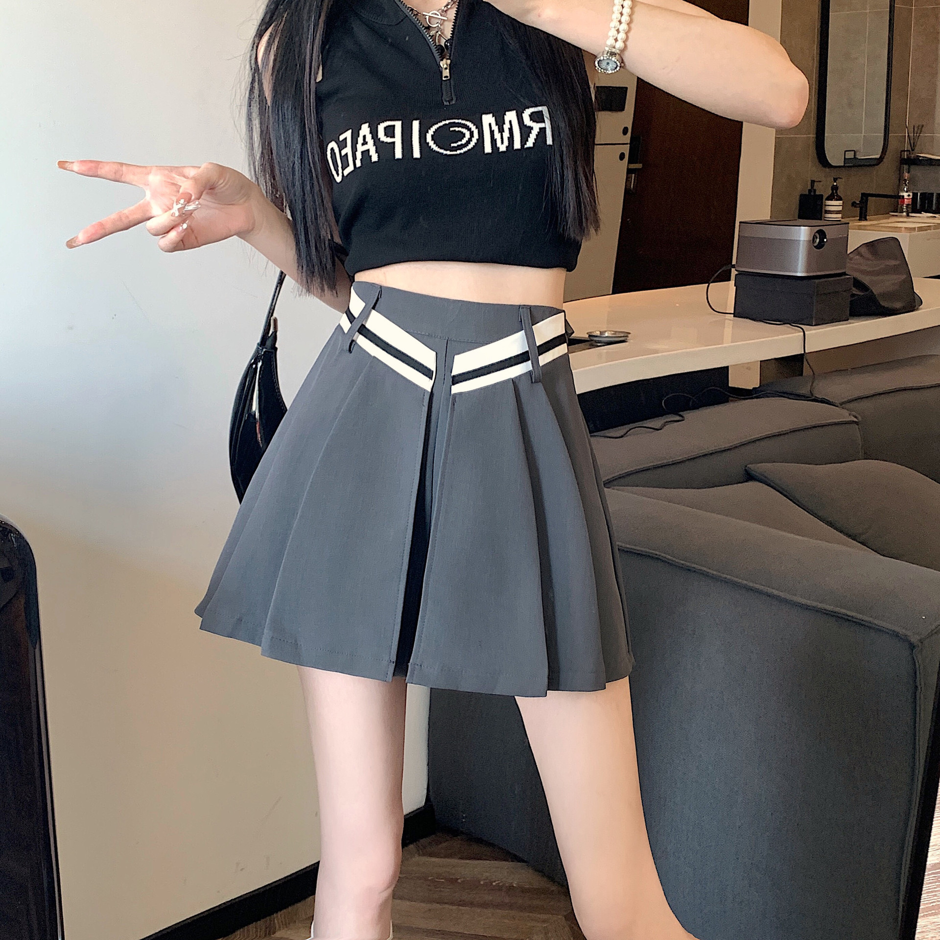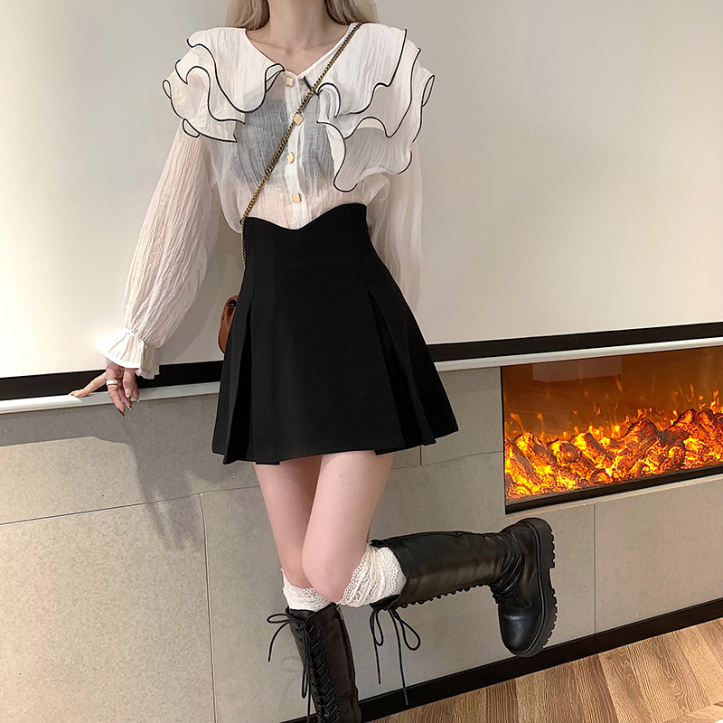 Rok pinggang tinggi ukuran plus hitam 2023 desain niche a-line cover rok lipit silang wanita rok pendek Musim Semi
