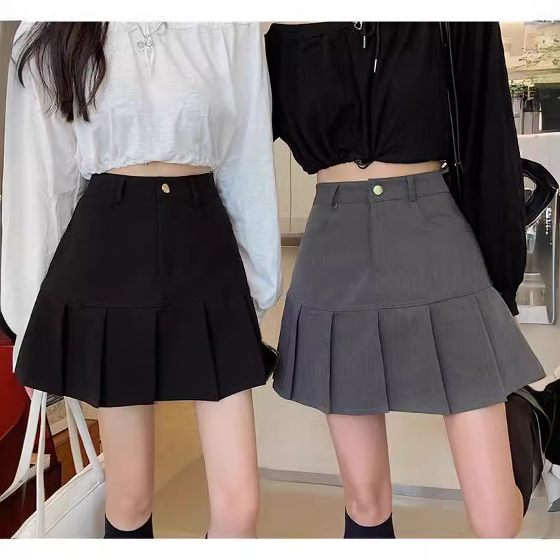 Rok Lipit JK Rok Pendek Warna Hitam Polos Model Dasar Rok Setengah Badan Abu-abu Ukuran Besar Terlihat Kurus Pinggang Tinggi Musim Panas Wanita Rok Panjang Sedang