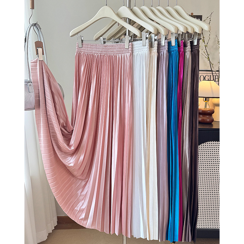 Rok Setengah Badan Lipit Permukaan Satin Terlihat Langsing Pinggang Tinggi Model Baru 2025 Musim Panas Wanita Rok Panjang Ayun Besar Huruf A