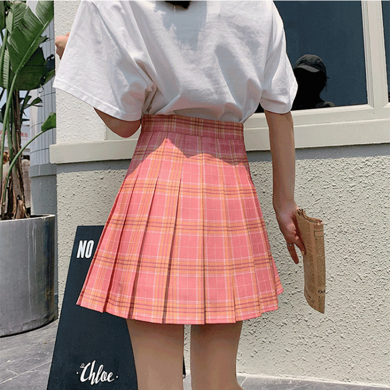 Rok lipit wanita musim panas, rok kotak-kotak 2024 untuk pelajar wanita, rok a-line hitam pinggang tinggi gaya Korea musim semi