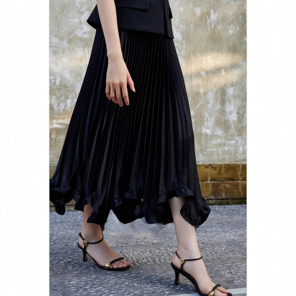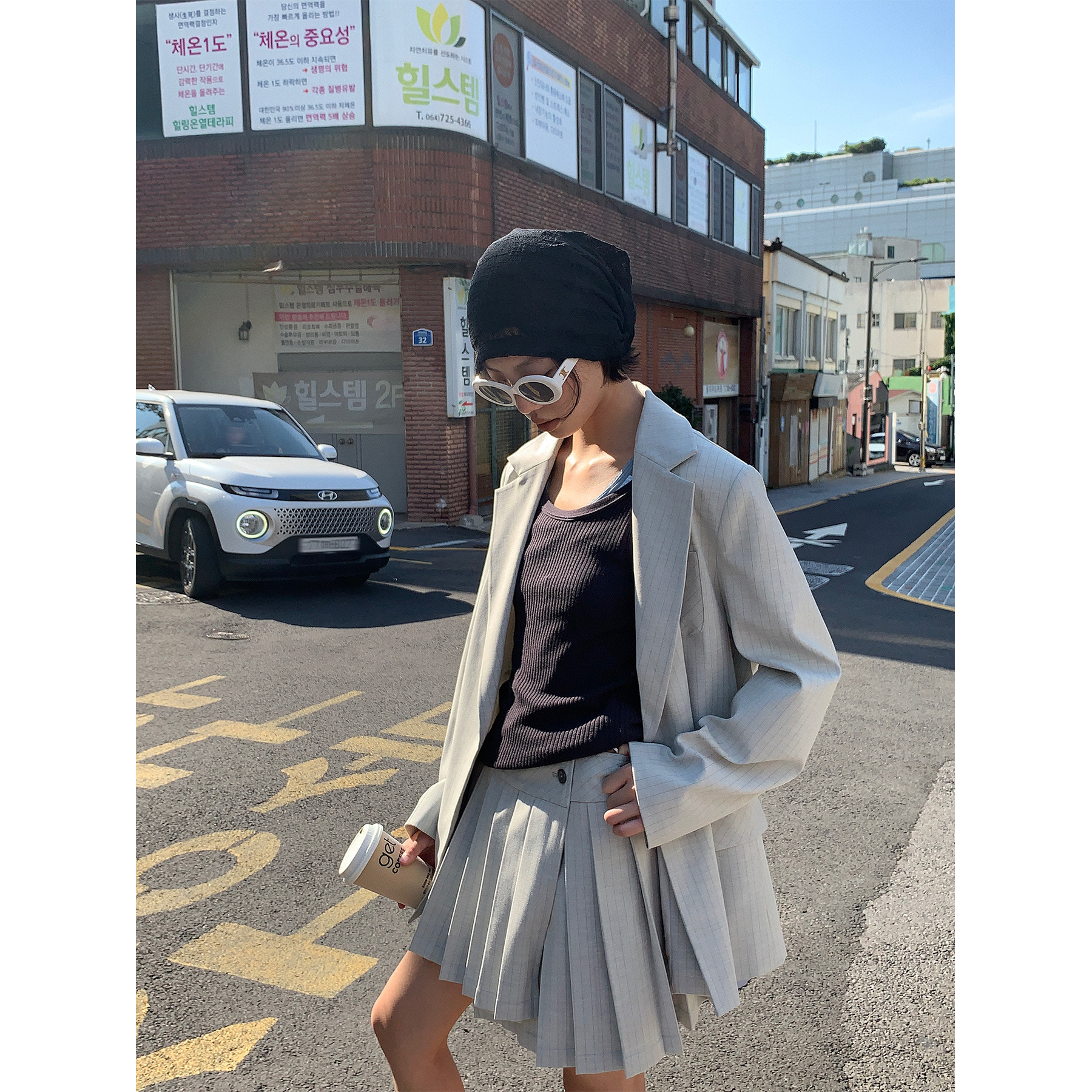 NEIHE内赫2025春秋条纹休闲西装不规则短款A子百褶半身裙女257085