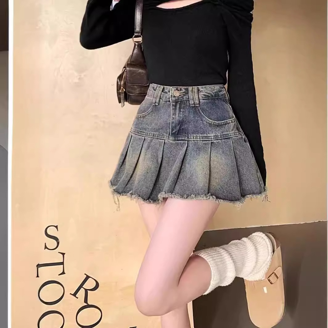 Rok Pendek Lipit Gaya Desain Tepi Daun Teratai Rok Denim Luar Mudah Dipadu Padan Gaya Kelas Tinggi 2025 Wanita Model Baru Gadis Pedas