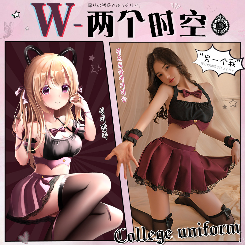 Manyan lingerie seksi halter berongga, pakaian seragam rok lipit pelajar JK, baju 8592 rambut generasi