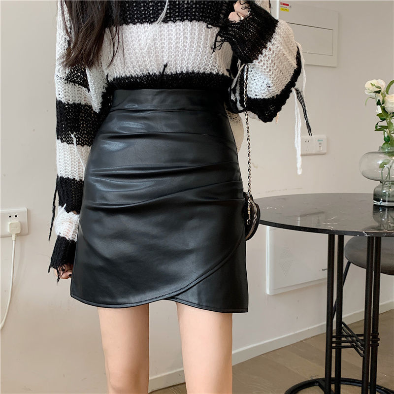 Rok lipit tidak beraturan kulit kecil wanita, rok pinggul model a-line pelangsing pinggang tinggi musim gugur musim dingin 2024