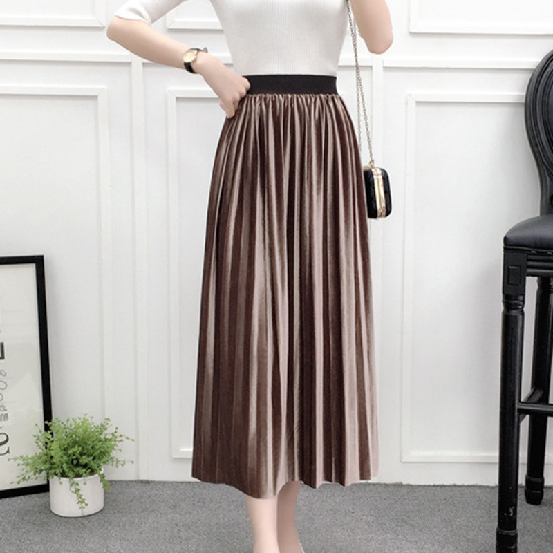 Real shot Musim Semi dan Musim Gugur 2024 rok wanita baru manis warna solid segar elegan pinggang tinggi beludru emas rok lipit
