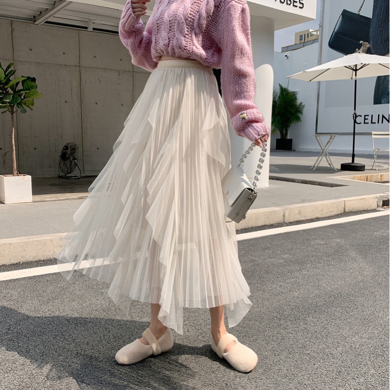 Rok midi gaya Korea trendi baru rok jala putih renda berlipat pinggang tinggi rok panjang menengah pelangsing